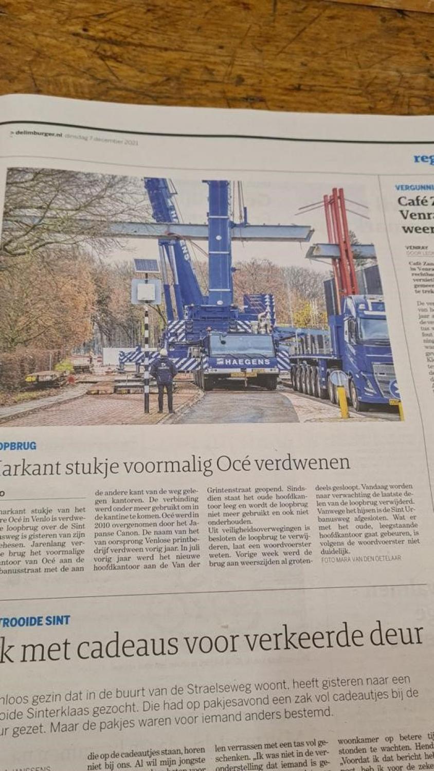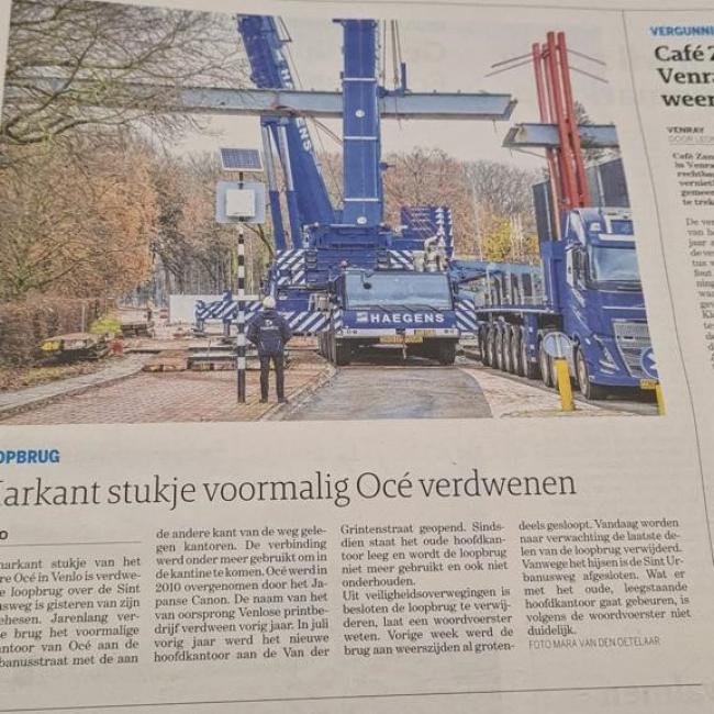 Vervolgens zijn de resterende onderdelen gedemonteerd en is begonnen met het opruimen en schoonmaken van het wegdek. Volgens planning en afspraak met de Gemeente Venlo was de rijbaan een dag later weer vrij voor het verkeer.