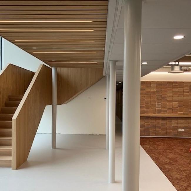 Het hele gebouw is gestript, diverse betonvloeren zijn weggehaald om plaats te maken voor de trap en de eerste verdiepingsvloer is met 1.2 m verbreed om meer gebruikersoppervlak te creĆ«ren. De hele inrichting en styling is veranderd met diverse glaswanden, wandbekledingen, nieuwe vloeren en plafonds. Een grote klus die we samen met onze onderaannemers binnen de afgesproken tijd gerealiseerd hebben.